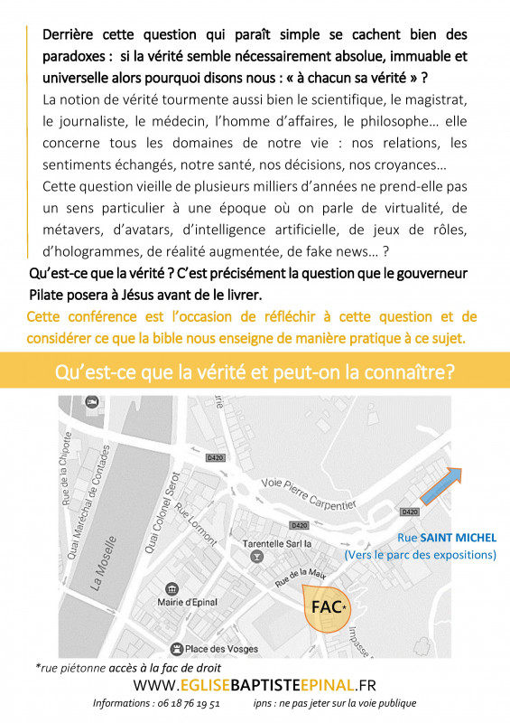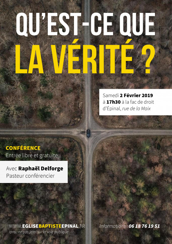 Nous organisons une conférence le samedi 2 février 2019 à 17h30 à la faculté de droit d'Epinal: Qu'est-ce que la vérité?