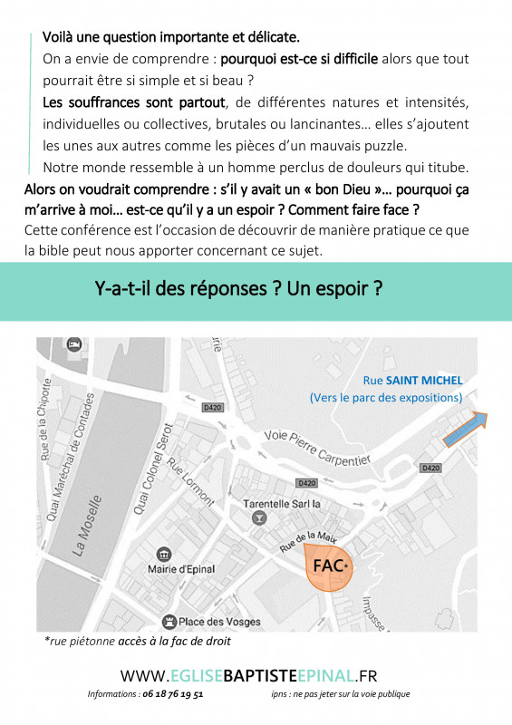 Nous organisons une conférence le samedi 29 juin 2019 à 17h30 à la faculté de droit d'Epinal: Pourquoi tant de souffrance?