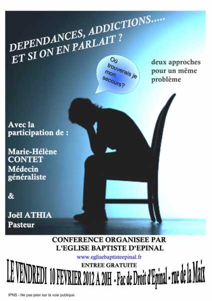Le 10 février 2012 à 20h nous avons organisé à la fac de droit d'Epinal, rue de la Maix, une conférence sur le thème des dépendances et des addictions avec la participation de Marie Hélène CONTET médecin généraliste à Luxeuil les bains et de Joël Athia pasteur à Nancy