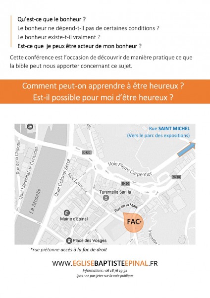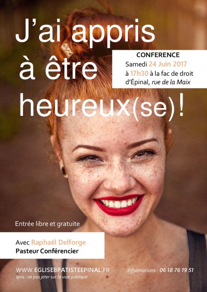 Nous organisons le samedi 24 juin à 17h30 à la fac de droit d'Epinal, rue de la maix, une conférence sur le thème "J'ai appris à être heureux(se)"
