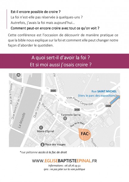 Nous organisons le samedi 23 septembre 2017 à 17h30 à la fac de droit d'Epinal, rue de la maix, une conférence sur le thème "Je voudrais croire, mais..."