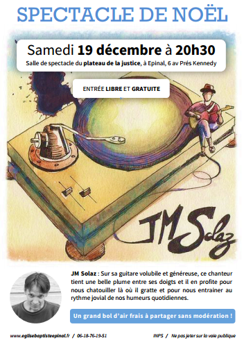 Un moment plein de détente, un grand bol d'air frais à consommer sans modération pour ce concert-spectcle de Noël avec JM Solaz, auteu r,compositeur interprète, l'occasion de réfléchir au sens d'un cadeau.