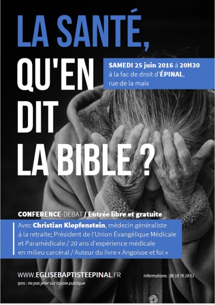 Nous organisons le samedi 25 juin à 20h30 à la fac de droit d'Epinal, rue de la maix, une conférence sur le thème: "La santé, qu'en dit la bible?"