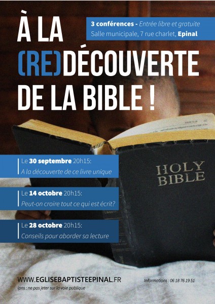 Nous organisons le vendredi 30 septembre à 20h15 à la salle Inter jeune 7 rue charlet à EPinal (près de la gare), une conférence sur le thème: "A la découverte de ce livre unique"
