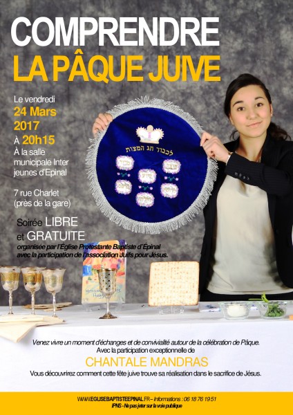 Nous organisons le vendredi 24 mars à 20h15 à la salle Inter jeune 7 rue charlet à Epinal (près de la gare), une conférence sur le thème: "Comprendre la Pâque Juive"