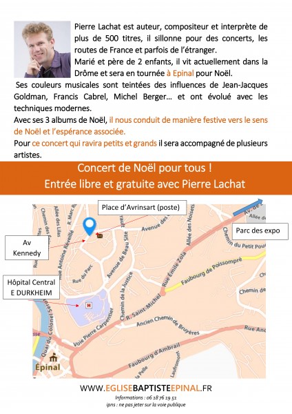 Pierre Lachat , auteur, compositeur et interprète de plus de 500 titres et de 2 albums de Noël. En tournée de Noël, il sera en concert à la salle de spectacle du plateau de la Justice Av Kennedy à Epinal le vendredi 15 décembre à 20h30.