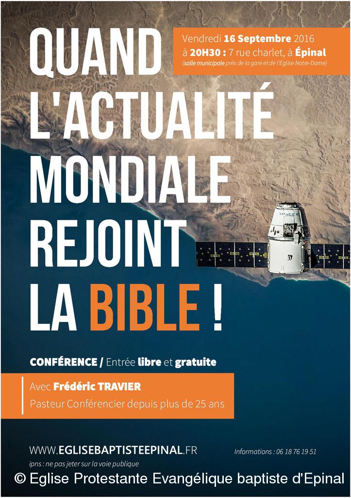 Frédéric Travier nous a montré comment l'actualité mondiale sur de très nombreux sujets rejoint ce qui a été écrit dans la bible il y a près de 2000 ans... de quoi une fois de plus se laisser interpeller par ce livre unique.
