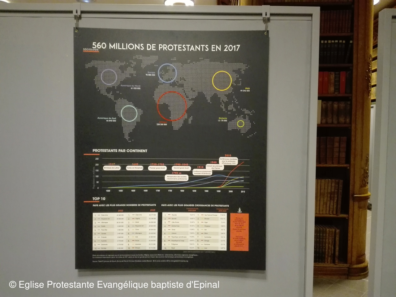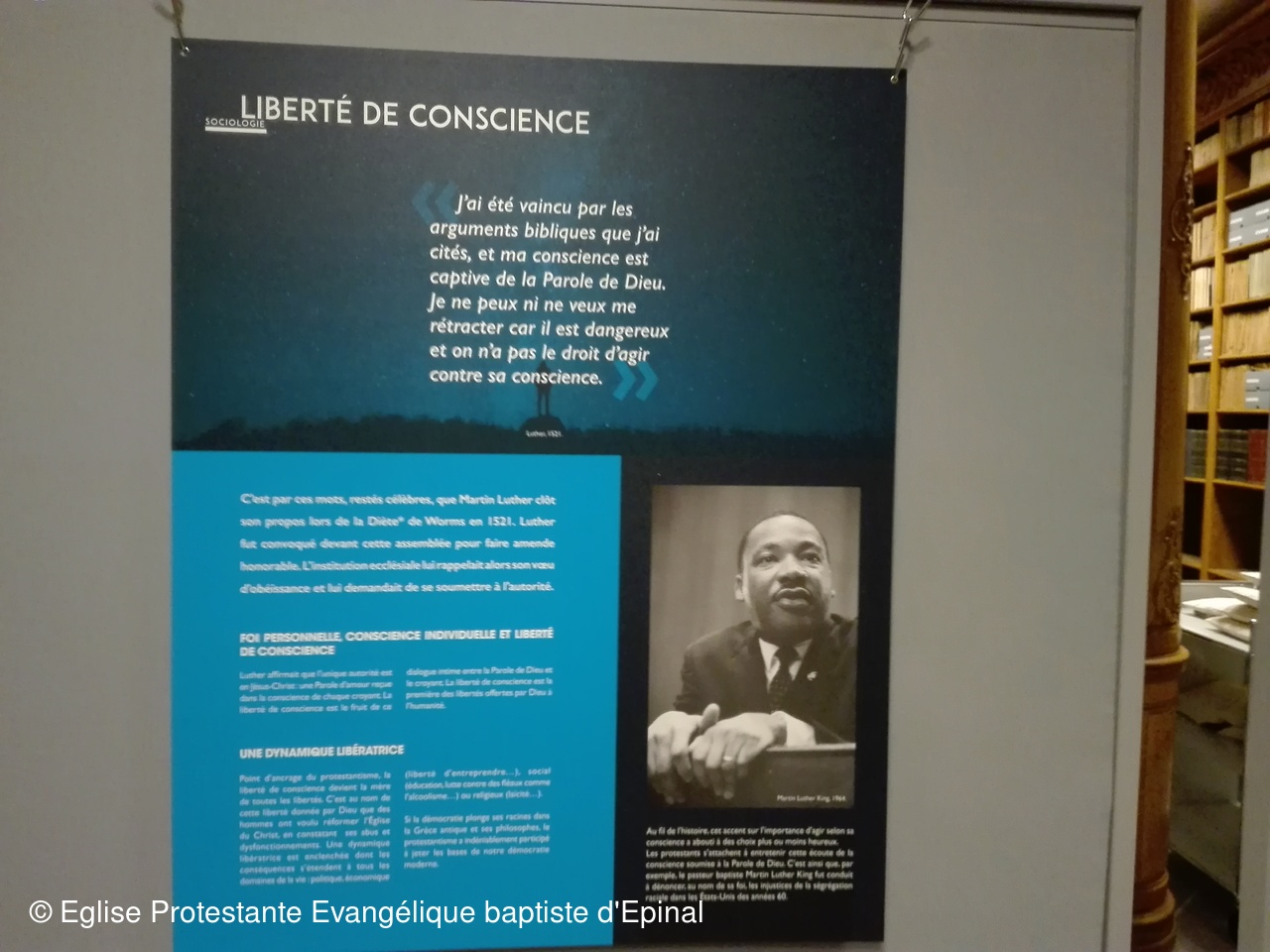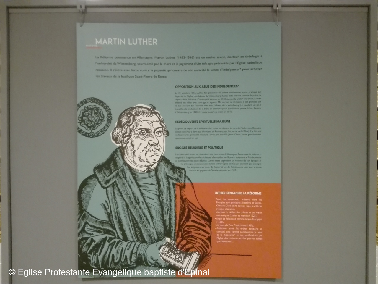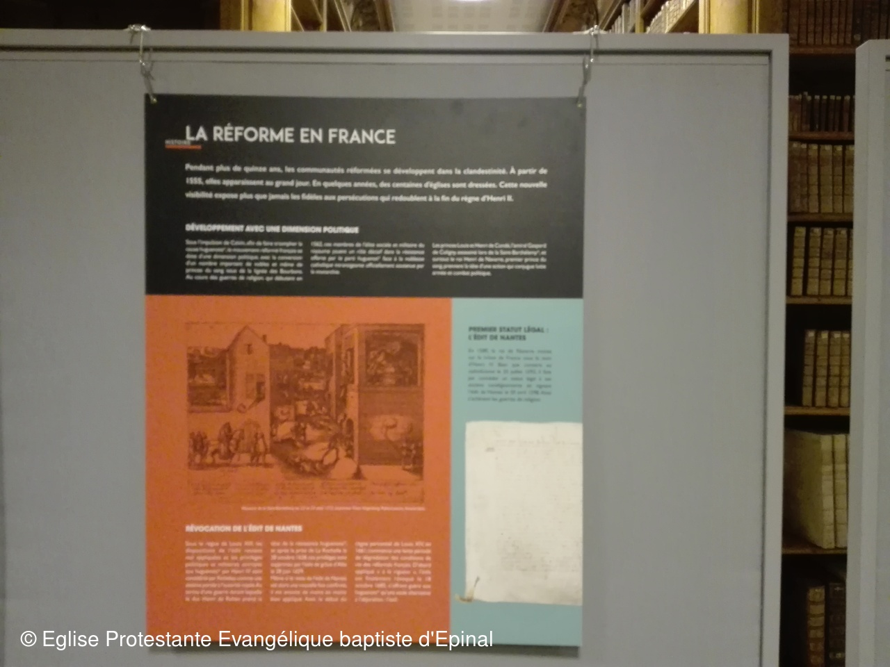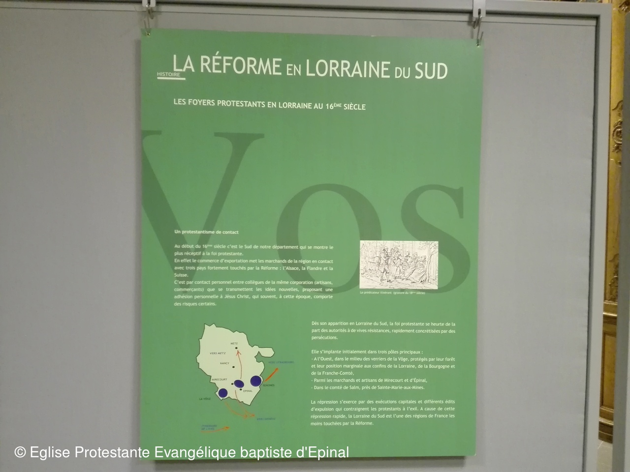 A l'occasion de l'anniversaire de la réforme, nous avons eu l'occasion d'installer une exposition à la Bibliothèque (BMI) d'Epinal. L'occasion de laisser chacun découvrir ces évènements avec en particulier 2 panneaux sur la Lorraine et les Vosges.